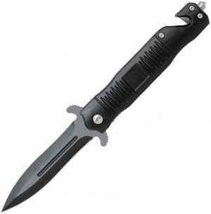 Assisted opening. 4.5″ (11.43cm) closed. 3.5″ (8.89cm) black oxide coated 8Cr13MoV stainless blade. Black anodized aluminum handle. Glass breaker. Belt/cord cutter. Extended tang. Pocket clip. Boxed.
