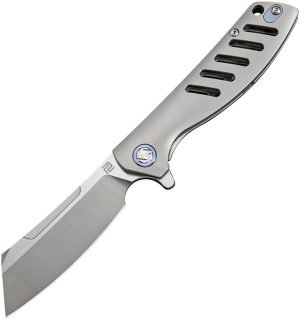 4″ closed. 3″ satin finish Bohler M390 stainless blade. Gray titanium handle. Extended tang. Lanyard hole. Pocket clip. Metal tin. Black nylon zippered storage case. Boxed.