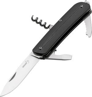 3.75″ closed. 2.75″ 12C27 Sandvik stainless blade. Black G10 handle. Lanyard hole. Tools include: Large screwdriver l Small screwdriver l Bottle opener l Wire stripper l Corkscrew l Pocket clip l Serrated blade l Glass breaker. Boxed.
