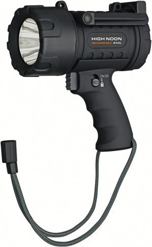 Clip. Rechargeable. Strobe. 850 lumen LED. Long-distance beam shines 550 yds. High, low, and strobe settings. Ultra-light rechargeable lithium-ion battery with USB cable (included). Soft-touch rubberized coating. Built-in folding stand with multiple positions for hands-free use. Long runtime: 24 hours on low setting. Safety Lock-Out on handle protects battery life. Waterproof, submersible and floating. Boxed with hanging tab.