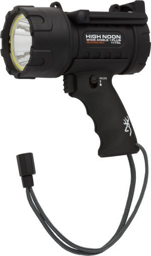 Water resistant. Impact resistant. Rechargeable. Lanyard. Strobe. Weight: 16oz. Modes: Long Distance (850 lumens, 1h 15m runtime, 503m beam distance); Wide Angle High (610 lumens, 1h 15m runtime, 37m beam distance); Long Distance plus Wide Angle (1175 lumens, 1h runtime, 443m beam distance); Wide Angle Low (37 lumens, 18h runtime, 9m beam distance). Battery power indicator. Last Light feature remembers the previous beam setting. Ultra intense wide angle and long distance beam. USB cord included. Power bank allows for charging of other devices. Recharges in 5 hours. Height: 6.63″. Requires (1) Lithium battery (included). Color: Black. Boxed with hanging tab.