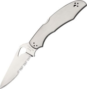 4 3/4″ closed lockback. 3 3/4″ partially serrated 8Cr13MoV stainless blade with thumb slot. Stainless handles. Four-way reversible stainless pocket clip.