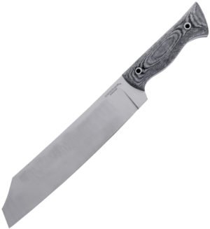 14.75″ overall. 9.75″ satin finish 1075HC steel blade. Black and white micarta handle. Full tang. Black leather belt sheath. Boxed.