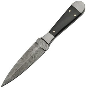 6.5″ (16.51cm) overall. 3.5″ (8.89cm) double edge Damascus steel blade. Horn handle. Stainless bolster(s). Full tang. Black nylon belt sheath. Boxed.