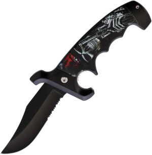 Assisted opening. 5″ (12.7cm) closed. 3.75″ (9.53cm) black finish partially serrated stainless clip point blade. Finger grooved synthetic handle. Extended tang. Pocket clip. Skull handle artwork. Boxed.