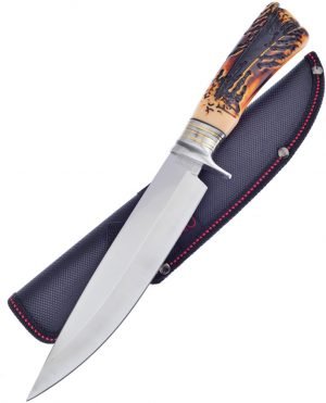 12.5″ (31.75cm) overall. 7.25″ (18.42cm) satin finish 3Cr13 stainless blade. Imitation stag handle. Full tang. Stainless guard with brass spacers. Black nylon belt sheath. Boxed.