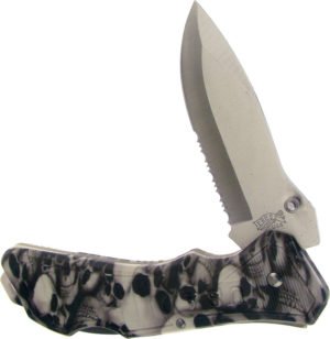 5″ closed. 3.5″ satin finish partially serrated stainless drop point blade. Camo nylon handle. Lanyard hole. Thumb stud. Skull handle. Boxed.