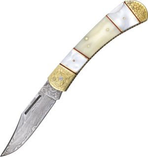 5″ closed. 3 5/8″ damascus steel clip point blade. Scroll worked backspring. White smooth bone and pearl onlays with red spacers. Gold plated nickel silver bolsters with flower engraving. Bulk packed.