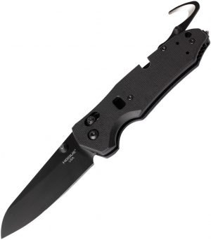 4.88″ (12.4cm) closed. 3.38″ (8.59cm) black Cerakote finish Bohler N690 stainless blade. Black G10 handle. Belt/cord cutter. Glass breaker. Thumb stud. Lanyard hole. Pocket clip. Ambidextrous ABLE Lock blade. Opposing bevel blade. Boxed.