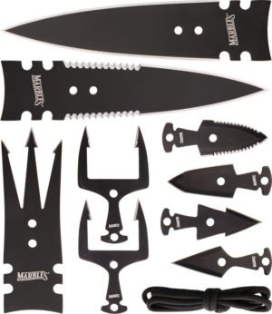 Construction: Stainless; Color: Black; Other Info: Set includes: 7″ standard edge spear head, 7″ partially serrated spear head, (4) 2.65″ arrow heads, (2) 3″ two-pronged gigs, and a 4.75″ Trident gig. Starter length of black paracord. Hang Packaged.