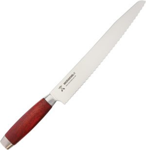 14 1/2″ overall. 10″ serrated stainless blade. Red wood handle with stainless ferrule and pommel.