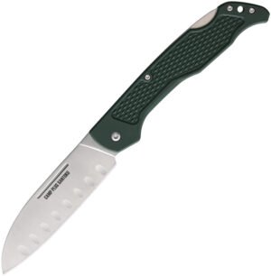 5.25″ (13.34cm) closed. 4.25″ (10.8cm) satin finish stainless blade. Green checkered glass filled nylon handle. Lanyard hole. Santoku blade. Boxed.