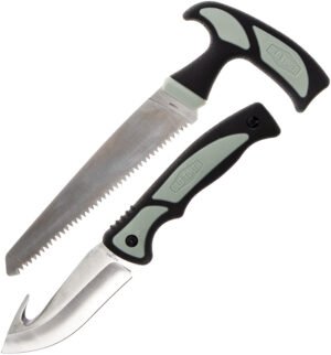 9″ (22.86cm) overall. 3.75″ (9.53cm) satin finish 8Cr13MoV stainless guthook blade. Black and gray TPE handle. Full tang. Includes 8.5″ overall saw with 6″ serrated blade. Black nylon belt sheath. Boxed with hanging tab.