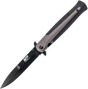 4.75″ closed. 3.75″ black finish false edge stainless dagger blade. Gray stainless handle with black nylon inlay. Thumb stud. Extended tang. Pocket clip. Boxed.