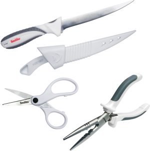 12″ (30.48cm) overall. 7″ (17.78cm) satin finish 420 stainless blade. TPE handle. Includes: 6.5″ pliers with split shot crimper, side cutters, nickel-plated carbon steel jaws, and leaf spring; Scissors with 3″ stainless blades with serrated cutting edge, can cut both mono and braided lines. White thermoplastic belt sheath. Clam packed.