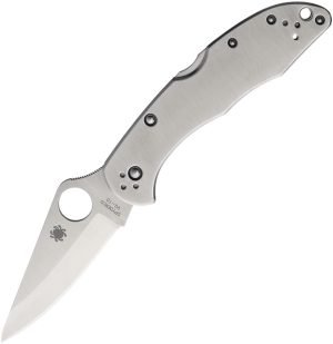 4.25 closed. 3 VG-10 stainless blade. Brushed stainless handle. Thumb pull. Pocket clip. Lanyard hole. Boxed. For More Details also read Spyderco Delica 4 Review by Best Knives Reviews