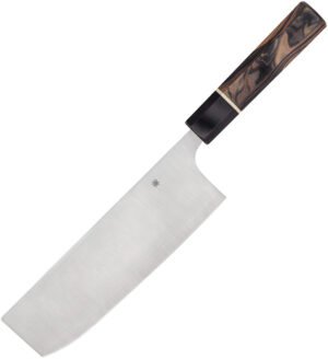 Spyderco Nakiri is a cleaver style kitchen knife that is built for long days in the kitchen. This cleaver knife is from the Itame series within the Murray Carter collection, characterized by burl G-10 handles with black G-10 bolsters. The Spyderco Murray Carter collection of kitchen knives are beautiful and functional kitchen tools for discerning chefs. Designed by master bladesmith Murray Carter, and built to precise standards by Spyderco in Seki City, Japan. The knives are characterized by their octagonal handles with hidden tangs, so the knife has a pleasant balance for long use. Key Features of Spyderco Itamae Nakiri Knife Burl (7.25″): * Murray Carter Collection. * 12.13″ (30.81cm) overall. 7.25″ (18.42cm) blade. * Burl G10 handle. * SUS410 stainless blade with Aogami Super Blue core. * Blade features Murray Carter’s signature “Carter Elbow,” a distinctive taper from the spine to the point that reinforces the blade’s tip. * Octagonal handle with black G10 ferrules. * Boxed.