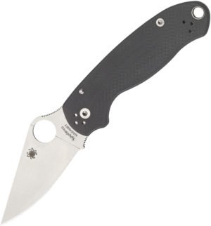 4.25 closed. 3 satin finish Maxamet tool steel blade. Gray G10 handle. Thumb pull. Pocket clip. Lanyard hole. Boxed. For More Details also read Spyderco Para 3 Review by Best Knives Reviews