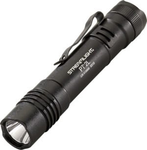 High Output LED Flashlight. 4 3/4″ overall. Black anodized aluminum construction with removable pocket clip. C4 white LED. 3 electronic modes. High mode — 180 lumen output, 2.5 hour burn time per battery set. Low mode — 10 lumen output, 50 hour burn time per battery set. Strobe mode — 6 hour burn time. Impact-resistant tempered glass lens. Water resistant to 1 meter. Rubber push button tail cap switch. Uses two CR123A lithium batteries (included). Black nylon belt sheath. Hang packaged. Lithium Metal with package.