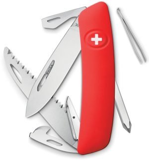 D06 Swiss Button Lock. 3.75″ closed. 2.75″ mirror finish 440 stainless blade. Red rubberized handle. Thumb pull. Tools include: Saw blade l Awl l Reamer with sewing eye l Bottle opener l Screwdriver tip l Small screwdriver l Wire crimper l Can opener l Phillips screwdriver l Tweezers. Boxed.
