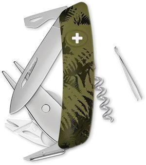 TT05 Tick Tool. 3.75″ (9.53cm) closed. Olive fern synthetic handle. Tools include: Blade with safety lock l Reamer with sewing eye l Bottle opener l Screwdriver tip l Wire crimper l Magnifying lens l Corkscrew l Tweezers. Divot tool l Tick tool. Boxed.