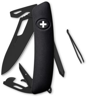 3.75″ (9.53cm) closed. Black finish blade. Black synthetic handle. Tools include: Blade with safety lock l Can opener l Bottle opener l Phillips screwdriver l Tweezers l Screwdriver tip l Keyring. Boxed.
