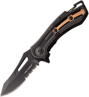 Assisted opening. 4.5 (11.43cm) closed. 3.25 (8.26cm) black finish partially serrated stainless blade. Black stainless handle with bronze stainless insert. Thumb pull. Attachment clip. Pocket clip. Boxed.