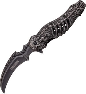 4 3/4 closed. 3 stonewash finish 440 stainless assisted opening blade with extended tang. Stonewash finish stainless handles with slot cutouts and skeleton embellishment. Stainless pocket clip.