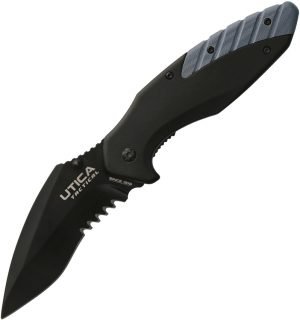 5 (12.7cm) closed. 3.5 (8.89cm) black oxide coated partially serrated 8Cr13MoV stainless blade. Black aluminum handle with Blue G10 insert. Thumb stud. Pocket clip. Clam packed.