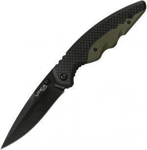 4.63 (11.76cm) closed. 3.5 (8.89cm) black oxide coated 8Cr13MoV stainless blade. OD green G10 handle with carbon fiber inlay. Thumb stud. Pocket clip. Clam packed.