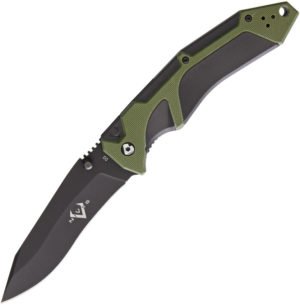 Assisted opening. 4.63 closed. 3.63 black finish D2 tool steel drop point blade. Green G10 handle with black FRN insert. Thumb stud. Pocket clip. Lanyard hole. Storage case.