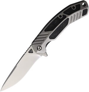 The V NIVES Tectonic Linerlock Gray CF (3.5) is a folding knife featuring a 3.5 satin finish S35VN stainless blade and a gray titanium handle with carbon fiber inlay. It includes an extended tang, lanyard hole, pocket clip, and comes with a hardside carrying case.