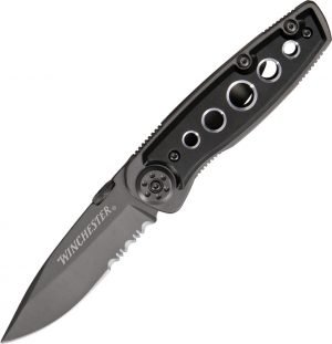 3.75 (9.53cm) closed. 2.75 (6.99cm) gray coated partially serrated stainless blade. Black wood handle. Thumb disk. Pocket clip. Clam packed.