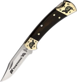 4.25 (10.8cm) closed. 3 (7.62cm) satin finish 420HC stainless clip point blade. Ebony wood handle. Brass bolster(s). Blade etching. Tortoise artwork on bolsters. Black leather belt sheath. Boxed.